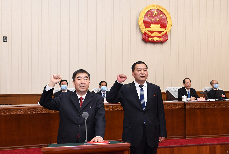 3月29日下午,自治区十三届人大常委会第三十四次会议举行了宪法宣誓仪式。自治区党委书记、人大常委会主任石泰峰主持并监誓。图为新任职人员依法进行宪法宣誓。