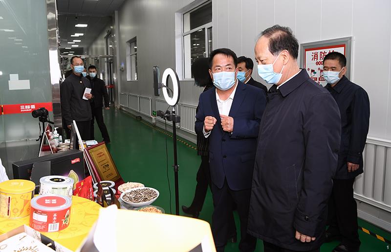 3月15日,自治区党委书记、人大常委会主任石泰峰来到巴彦淖尔市三胖蛋食品有限公司,了解生产加工和网上平台销售情况。内蒙古日报社融媒体记者袁永红摄