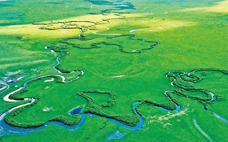 内蒙古锡林郭勒盟乌拉盖九曲湾蜿蜒曲折,像一条哈达镶嵌在绿色大地上。 内蒙古日报社供图