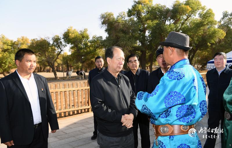 10月11日,自治区党委书记、人大常委会主任石泰峰来到阿拉善盟额济纳旗巴彦陶来苏木乌苏荣贵嘎查,走访牧民了解生产生活情况。内蒙古日报社融媒体记者 袁永红 摄