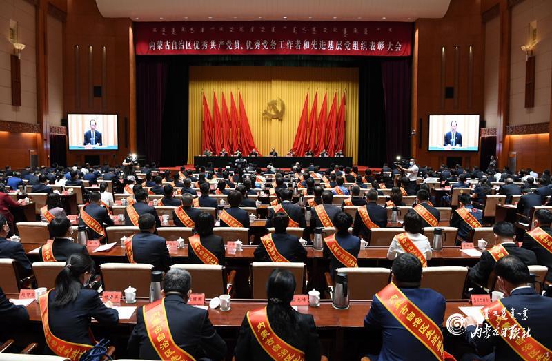 会场正幕中央党徽高悬,两侧红旗鲜艳夺目,气氛庄重热烈。上午9时许,表彰大会在雄壮的《义勇军进行曲》中开始,全体起立奏唱国歌。随后,自治区党委常委、组织部部长杨伟东宣读了《内蒙古自治区党委关于表彰内蒙古自治区优秀共产党员、优秀党务工作者和先进基层党组织的决定》。自治区党委决定,对国琪等200名共产党员、姜娜等100名党务工作者、呼和浩特市回民区环河街道太平街社区党委等100个基层党组织予以表彰,分别授予“内蒙古自治区优秀共产党员”“内蒙古自治区优秀党务工作者”“内蒙古自治区先进基层党组织”称号。石泰峰、布小林等自治区领导为受表彰的先进个人和先进集体代表颁奖,会场响起热烈掌声。