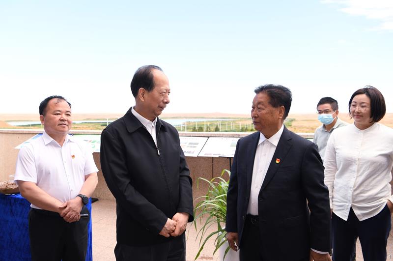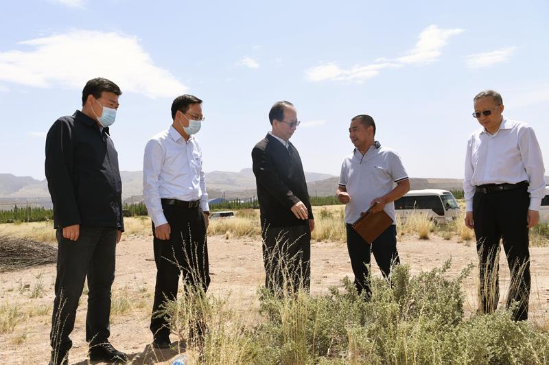 6月9日,自治区党委书记、人大常委会主任石泰峰来到阿拉善盟阿拉善高新技术产业开发区,查看乌兰布和沙漠生态治理和黄河生态保护情况。(摄影 袁永红)