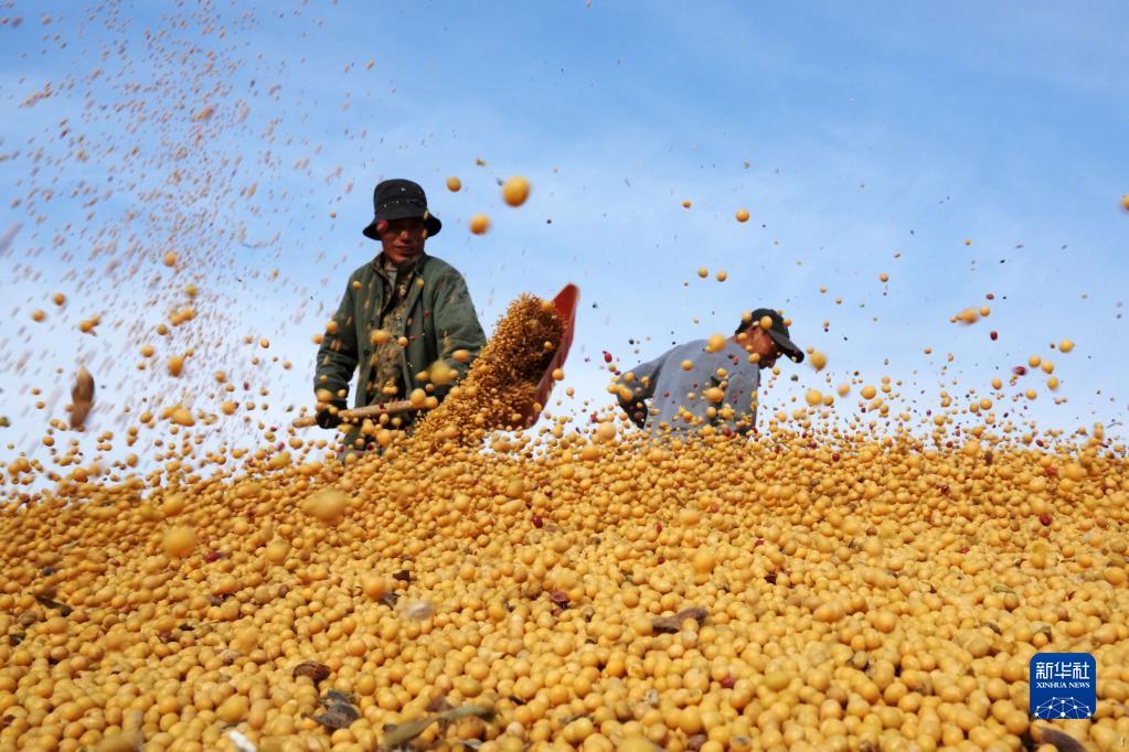 2022年10月20日,在北大荒农垦集团有限公司北安分公司赵光农场有限公司,工作人员在一处晒场的大豆堆上忙碌。新华社记者 王建威 摄