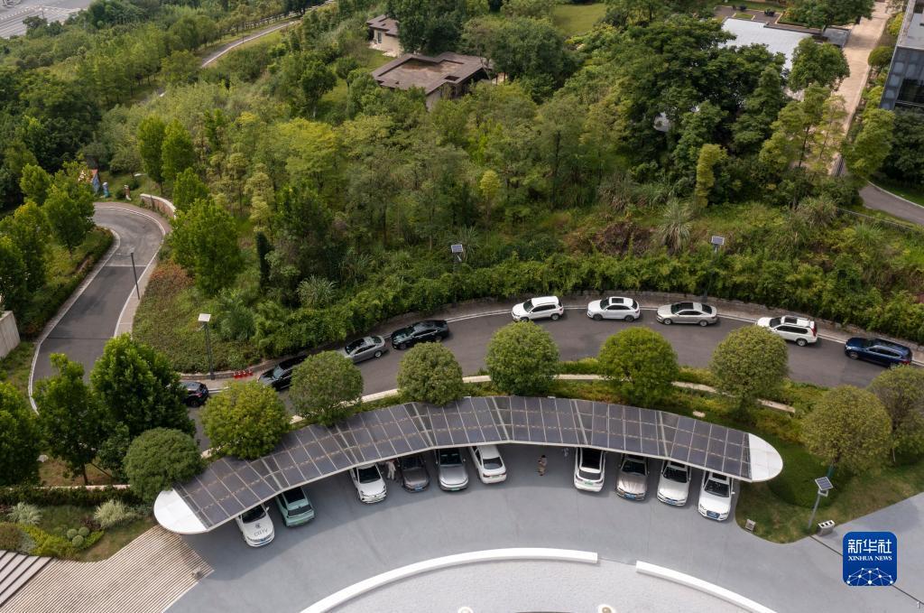 2022年6月16日拍摄的已建成投用的重庆首座光伏充电发用一体充电站(无人机照片)。新华社记者 刘潺 摄