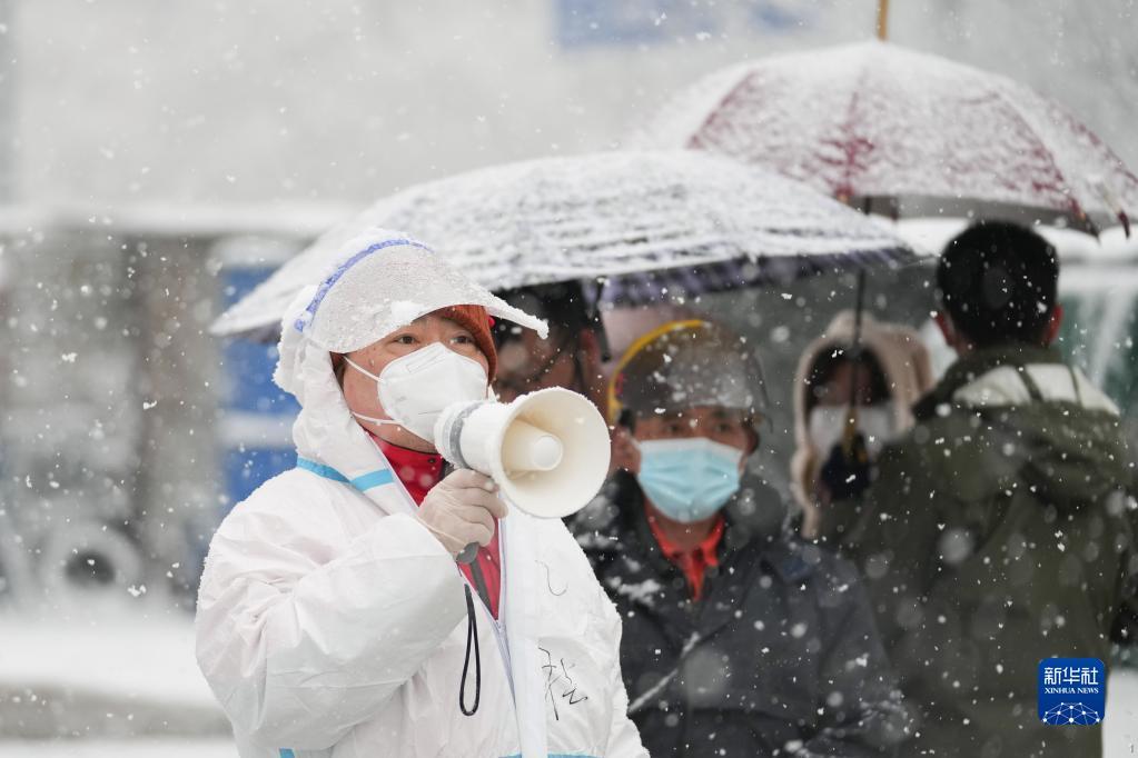 3月18日,在北京市东城区北新桥街道一处核酸采样点,工作人员冒雪引导前来检测的居民。新华社记者 鞠焕宗 摄