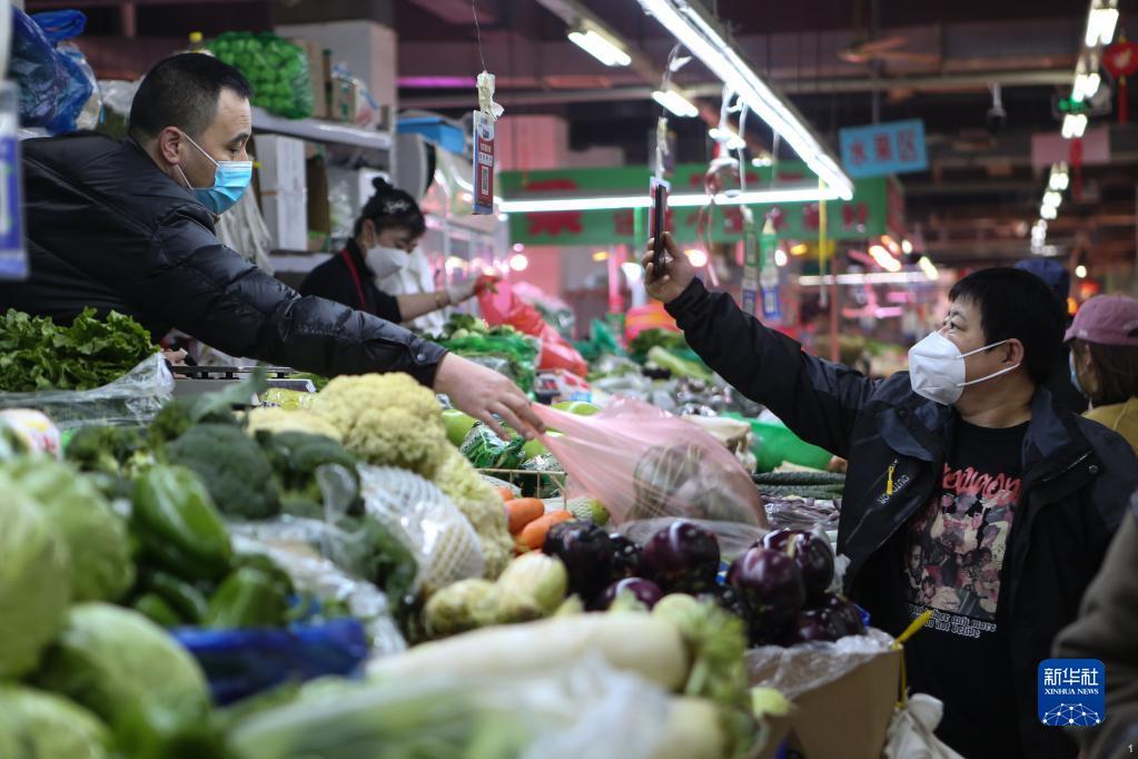3月25日,在辽宁省沈阳市凤祥综合市场,一名市民买菜后扫码付款。新华社记者 王乙杰 摄