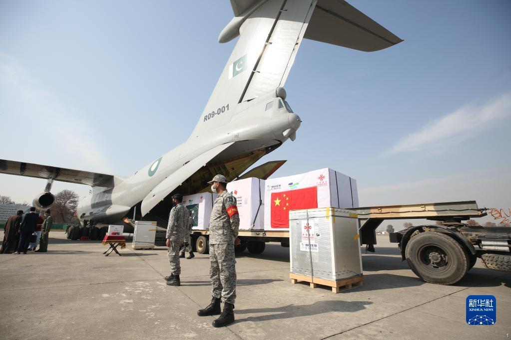 这是2021年2月1日在巴基斯坦首都伊斯兰堡附近的努尔汗空军基地拍摄的中国政府援助新冠疫苗交接仪式现场。新华社记者 刘天 摄