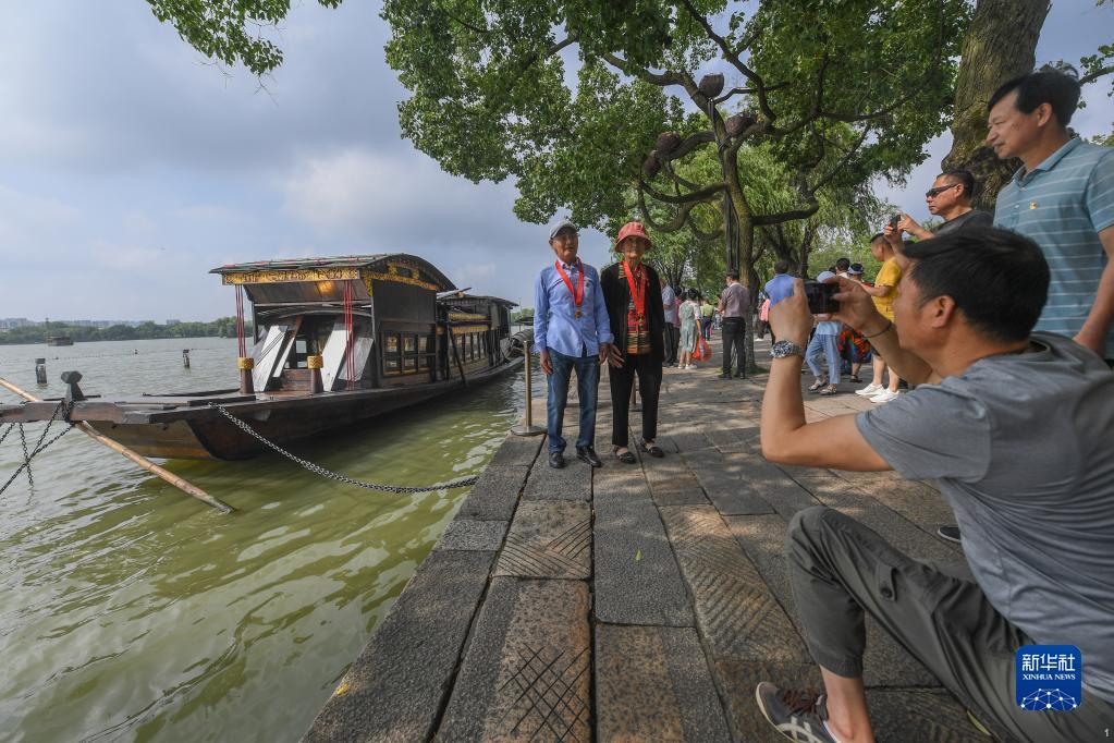 两名老党员在浙江嘉兴南湖湖心岛停泊的南湖红船旁拍照留影(7月1日摄)。新华社记者 徐昱 摄