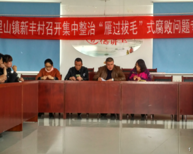 在3月27日我们召开了新丰村集中整治“雁过拔毛”式腐败问题专项会议。参会人员有村两委、党员代表、村民代表、村理财小组代表、村务监督委员会。共同学习了镇纪委有关“雁过拔毛”式腐败问题的文件,典型案例,并结合我村的实际要求村两委、村民代表、理财小组、村务监督委员会确实理解文件的相关实质,对村财、村务、村资起到有效的监督和管理,解决杜绝“雁过拔毛”式腐败事件的发生。代表们对当下的工作纪律还是比较认可的,和以前的工作状态也是不一样的,认为这样的感觉很正规,工作效率也高了不少。但我也在从中看到许多代表总是认为自己听到的就是事实,以讹传讹,混淆视听,从不听正面引导的话语。