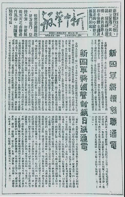 1941年1月23日《新中华报》载新四军将领就职通电和声讨亲日派通电。