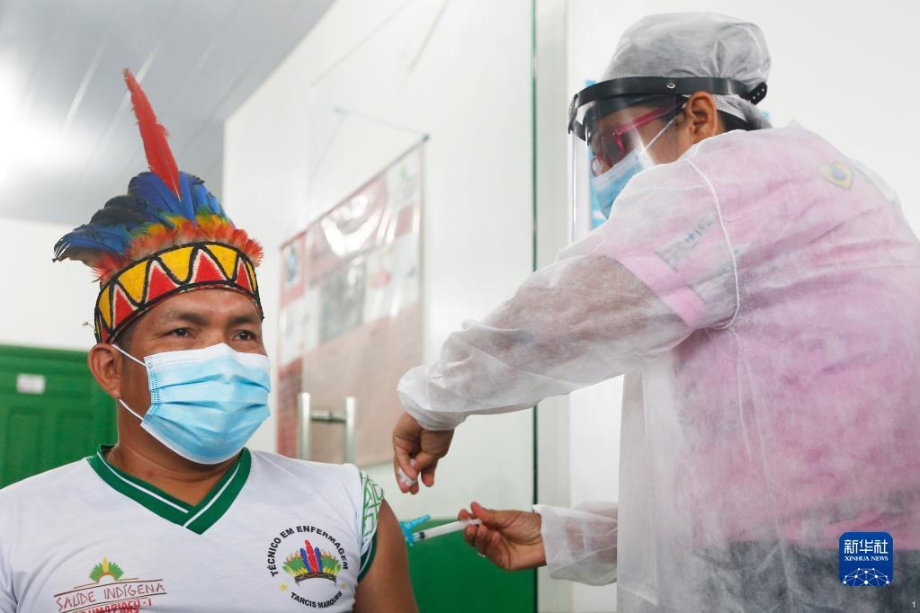 医护人员在巴西亚马孙州塔巴廷加市为一名原住民接种中国新冠疫苗(2021年1月19日摄)。新华社发(卢西奥·塔沃拉摄)