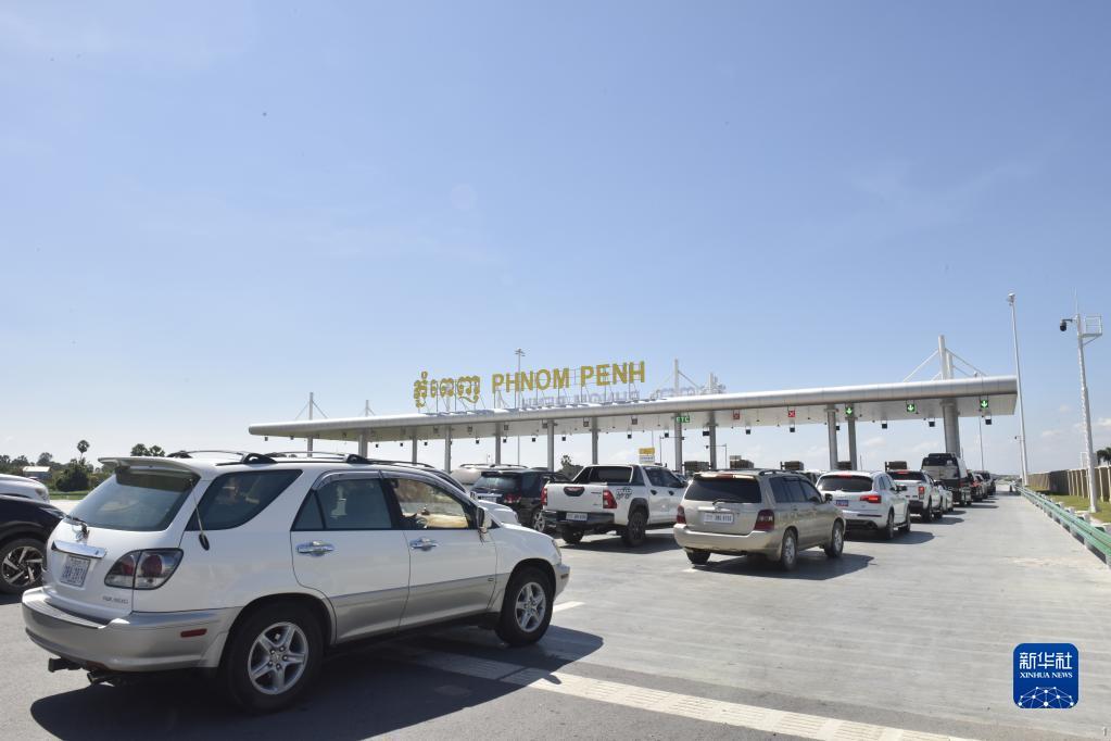 车辆在柬埔寨首都金边的金港高速公路入口处排队(2022年11月7日摄)。新华社记者 吴长伟 摄