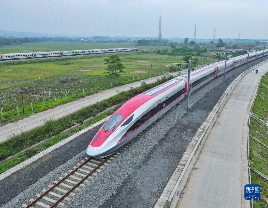 在印度尼西亚西爪哇省万隆市,一列高铁动车组正在雅万高铁试验段进行热滑试验(2022年11月9日摄,无人机照片)。新华社发(李培养摄)