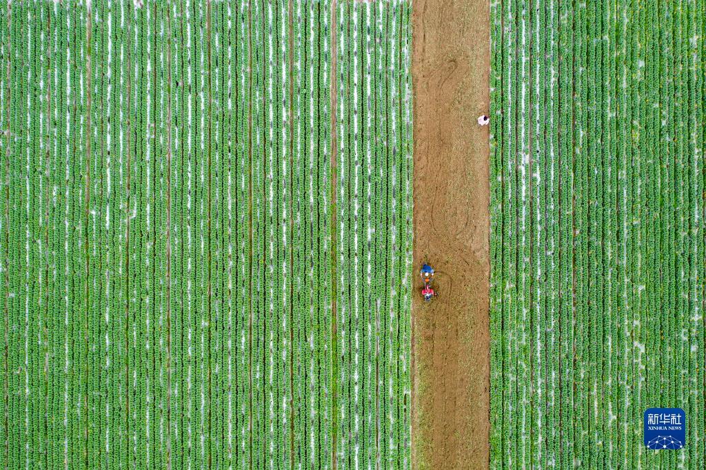在四川省阆中市彭城镇,村民驾驶农机翻耕菜地(2月23日摄,无人机照片)。新华社发(王玉贵 摄)