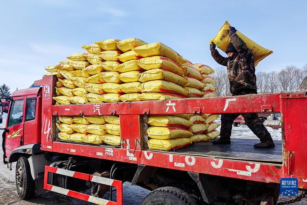 北大荒集团五大连池农场科技服务中心工人在装运肥料(2月16日摄)。新华社发(陆文祥 摄)