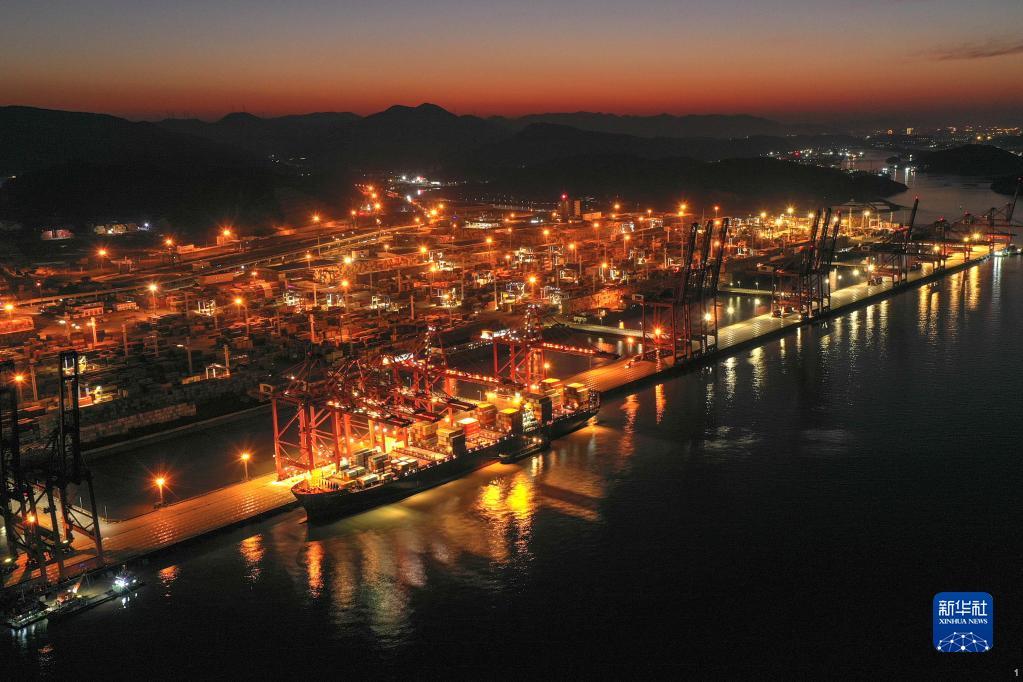 夜幕下,一艘货轮停靠在宁波舟山港穿山港区集装箱码头(1月31日摄,无人机照片)。新华社记者 黄宗治 摄