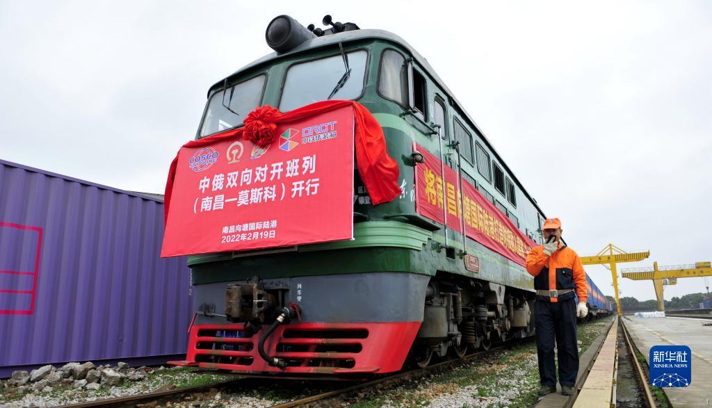 2022年江西首列中俄双向对开班列(南昌—莫斯科)在南昌向塘国际陆港准备出发(2022年2月19日摄)。新华社记者 彭昭之 摄