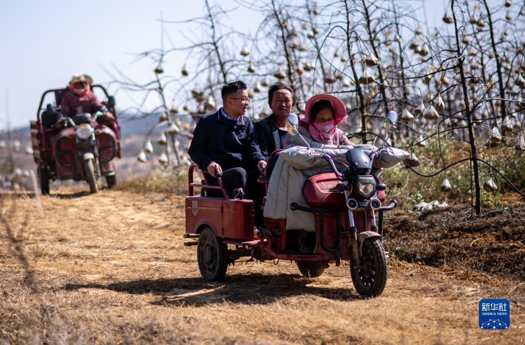 全国人大代表袁海波(右三)在云南省曲靖市马龙区一种植基地了解务工人员就业需求(2月11日摄)。新华社记者 江文耀 摄