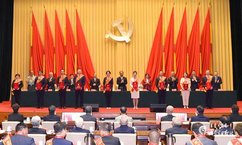6月29日上午,出席大会的自治区领导为受表彰的优秀党务工作者代表颁发奖章和证书。(摄影 马建荃)