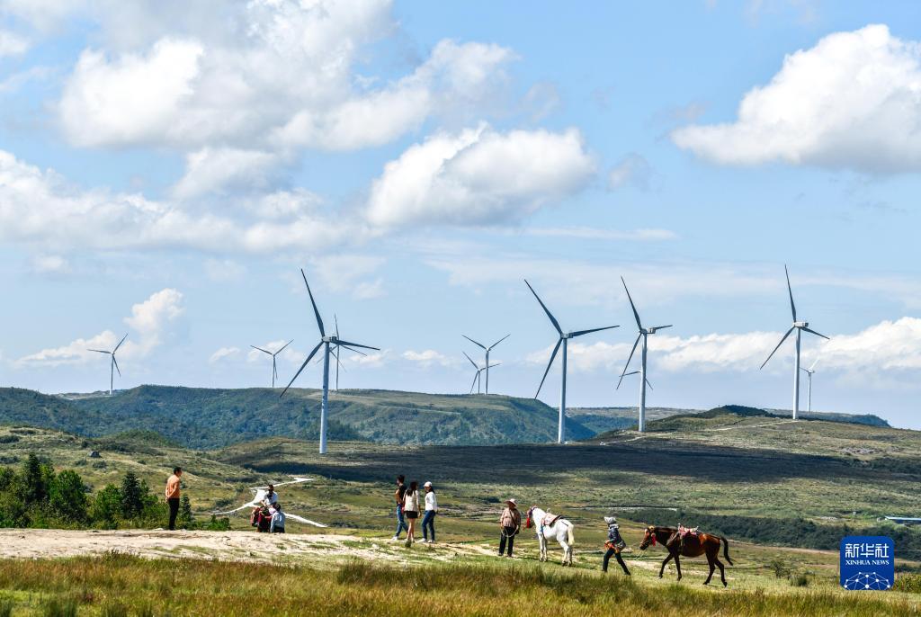 游客在贵州省龙里县龙里大草原的风电场观光(9月21日摄)。新华社记者 杨文斌 摄
