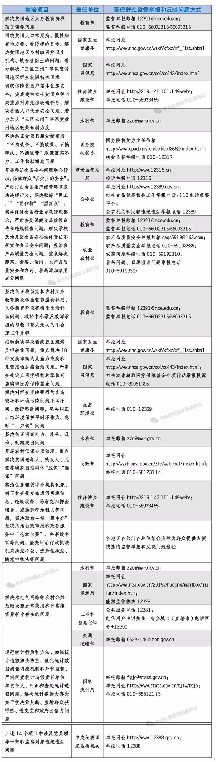 按照党中央在“不忘初心、牢记使命”主题教育中开展专项整治的要求,近日,中央纪委国家监委机关牵头、会同15个中央国家机关制定了《在“不忘初心、牢记使命”主题教育中专项整治漠视侵害群众利益问题的实施方案》,部署开展对4个方面14项突出问题的专项整治。此次专项整治聚焦扶贫领域腐败和作风问题,聚焦教育医疗、环境保护、食品药品安全等民生领域侵害群众利益问题,聚焦发生在群众身边的不正之风和“微腐败”问题,聚焦统计造假问题,着力解决群众最关心最直接最现实的利益问题,不断增强人民群众的获得感、幸福感、安全感。为方便群众参与监督和反映问题,现将专项整治受理群众监督举报和反映问题方式公布如下。