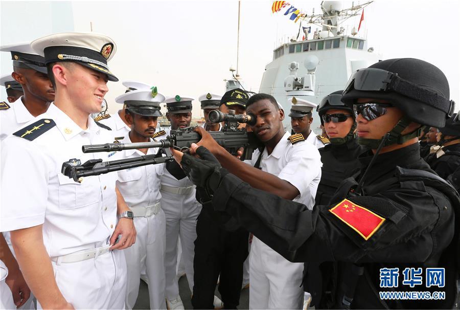 2015年8月27日,中国海军152舰编队访问苏丹红海州期间,苏海军学院学员参观济南舰时,亲身体验特战队员的武器装备。