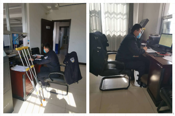2020新年伊始,新型冠状病毒来势汹涌,坚决遏制疫情蔓延势头,打赢疫情防控攻坚战是每一名民警的职责与使命。巴音陶亥派出所民警高希伟,因意外致右脚骨折,带着伤痛一直坚守在工作岗位,积极开展各项疫情防控工作,同时还负责所内户籍管理及后勤保障工作,至今已连续工作了四十多天。