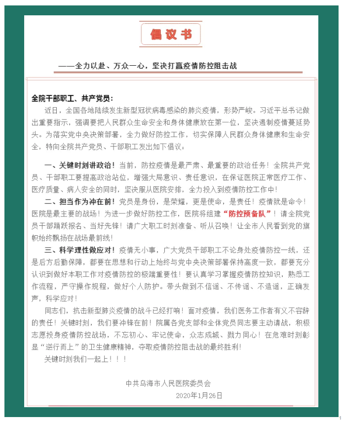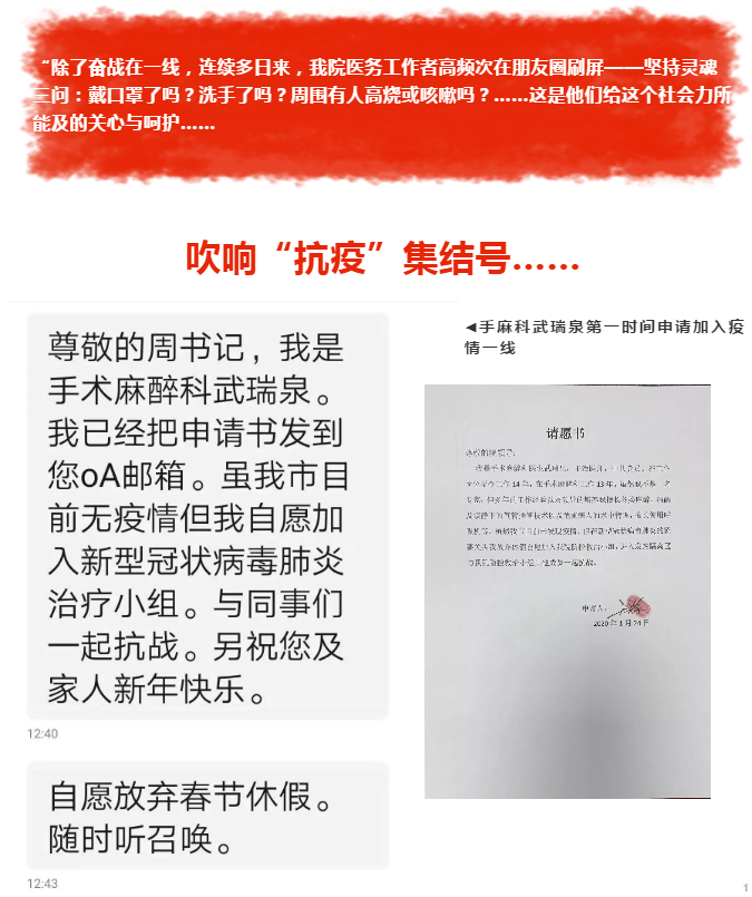 党委书记周兆海:“同志们,抗击新型肺炎疫情的战斗已经打响!面对疫情,我们医务工作者有义不容辞的责任!关键时刻,我们要冲锋在前!全力以赴,打赢这场防控阻击战!”