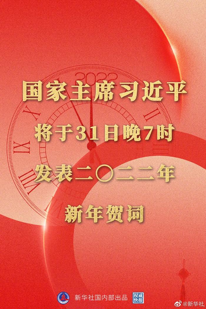 新华社北京12月30日电 国家主席习近平将于31日晚7时通过中央广播电视总台和互联网,发表二〇二二年新年贺词。中央广播电视总台所属中央电视台综合频道、新闻频道、中文国际频道、4K频道,中国国际电视台各外语频道,中央人民广播电台,中国国际广播电台,以及人民网、新华网、央视新闻客户端等中央主要新闻媒体所属网站、新媒体平台将准时播出。