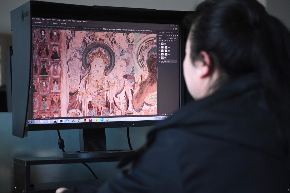 敦煌研究院文物数字化保护团队图像处理人员年海丽在拼接壁画图像(2023年4月25日摄)。数字化探索为莫高窟的保护与传承开辟了全新路径,数字技术让敦煌文物走出洞窟,跨出国门,走向“永久保存、永续利用”。新华社记者 陈斌 摄
